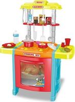 В комплект игровой детской кухни входит 43 аксессуара для готовки: различные продукты (фрукты, овощи, креветки и т.п.), кухонные приборы, половники, ложки, вилки, сковородки с крышками, кастрюльки, кашпо с продуктами, доска с мелком для записей, из крана течет настоящая водичка (в раковину нужно добавить около 200 мл воды), светомузыкальная вытяжка с различными звуками и мелодиями, дверки духовки и холодильника открываются, ручки конфорки поворачиваются, такие сюжетно-ролевые игры хорошо развивают фантазию и мышление детей, помогают сформировать навыки приготовления пищи и уборки, изучить правила поведения с техникой на кухне.
