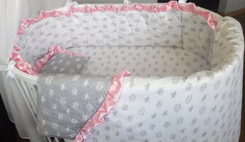 Роскошный детский бортик состоит из 6-ти отдельных подушек, выполненных из нежнейшего сатина (100% хлопок), обрамлённых атласным рюшем и декоративными бантами. Бортик подходит как для круглой люльки так и для овальной кроватки. Каждая подушечка с двух сторон украшена бусинами, которые крепко пришиты к бортику.