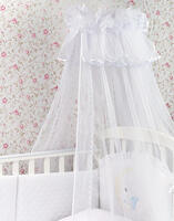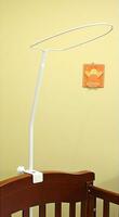Держатель для балдахина крепится в двух местах на детскую кроватку в торцевой или боковой части кроватки. Сделан из металлической трубы, покрыт безопасной для здоровья ребенка белой краской. Держатель разборной.