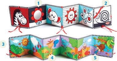 Сторінки містять різні захоплюючі елементи. Різні текстури матеріалів допоможуть дитині розвинути тактильні відчуття. З допомогою мотузочок книжку можна закріпити на бортику ліжечка.