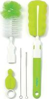 Оснащений двома змінними наконечниками для миття пляшок, один із яких закінчується щіткою з м'якою силіконовою щетиною, а інший виконаний із профільованої губки. Обидва кінці можна вільно міняти. У комплект також входить силіконова насадка для чищення сосків. Кожна кисть має круглий отвір для підвішування, щоб її було легше висушити перед використанням. Виготовлений із міцних та безпечних матеріалів, що не містять бісфенол А (% BPA).